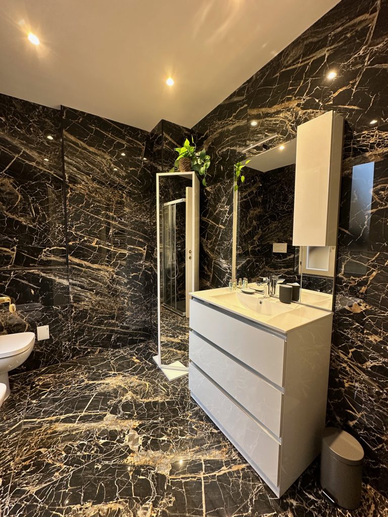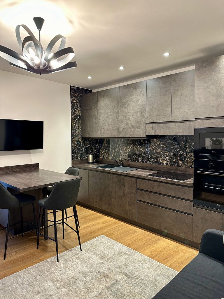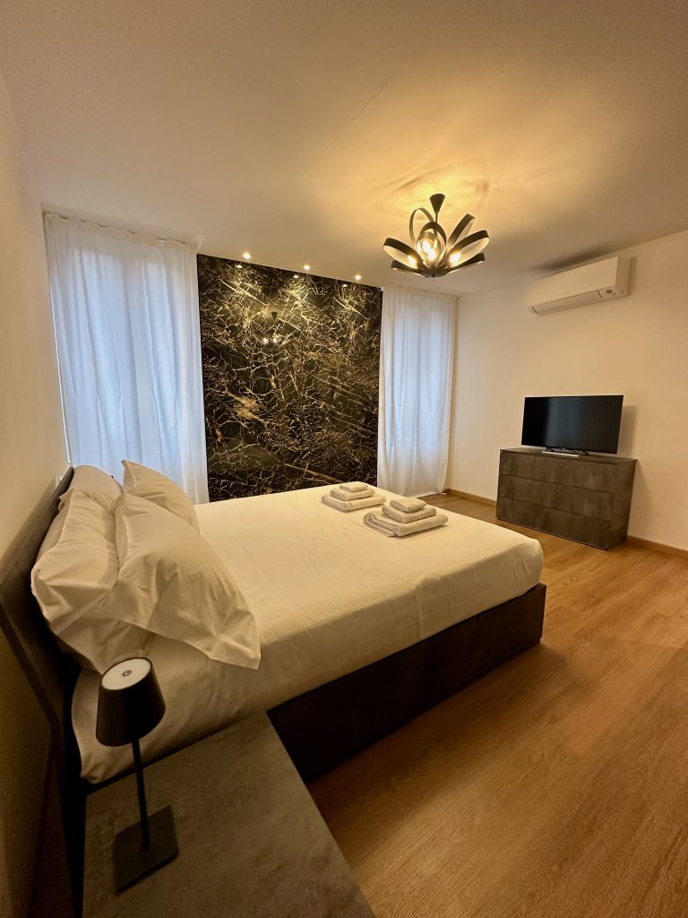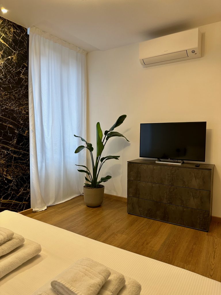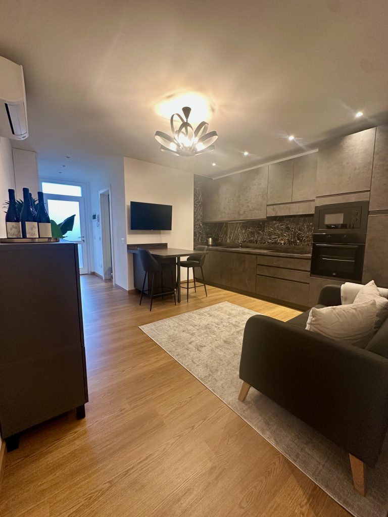 L’appartamento è composto da un soggiorno con cucina completa, dotata di frigorifero, forno, microonde, piano cottura, lavastoviglie e macchina per il caffè Nespresso. La zona living include un comodo divano per rilassarsi guardando la TV con accesso a Netflix, Amazon Prime e YouTube. La camera matrimoniale è spaziosa e dotata di un comodo materasso memory, mentre il bagno moderno è dotato di una doccia e di tutti i comfort necessari per il soggiorno.