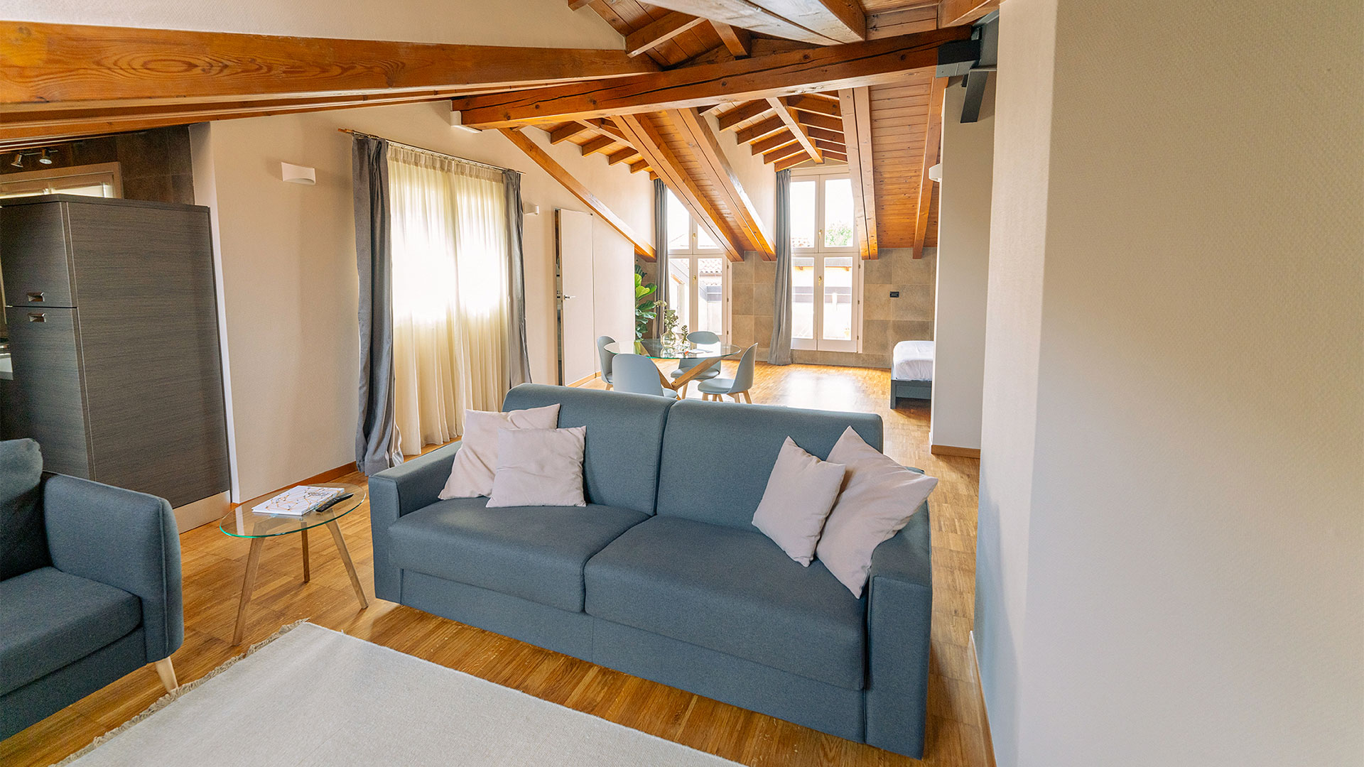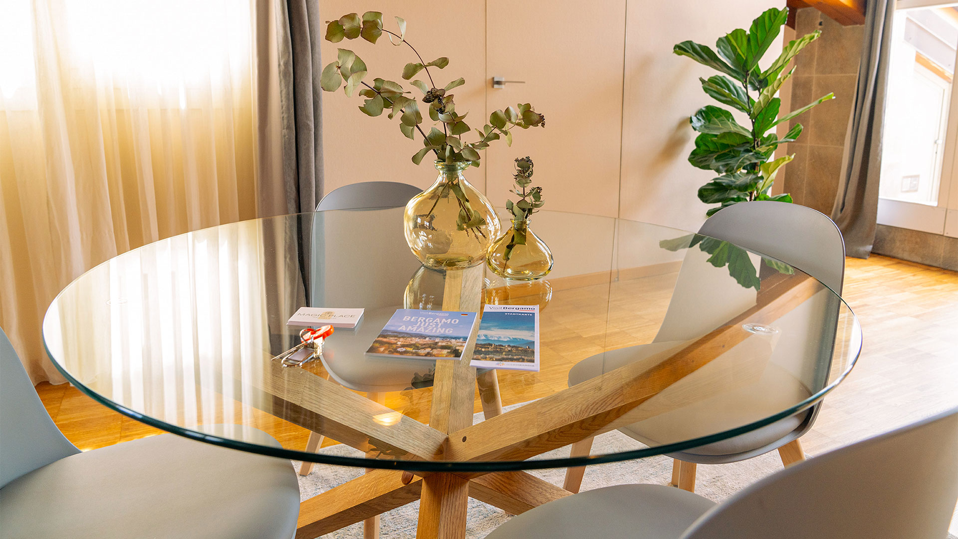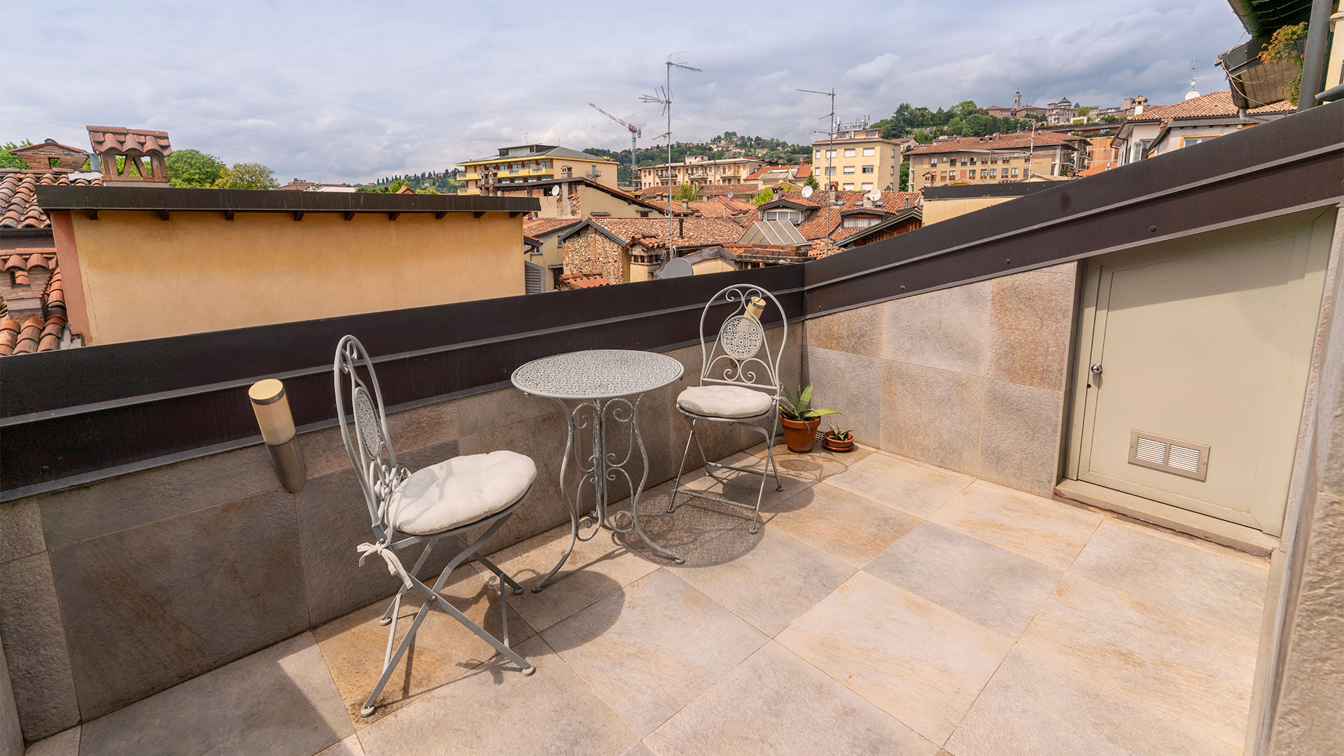 Il terrazzo privato offre una vista incantevole sui tetti del quartiere e sulla Città Alta, creando l’ambiente ideale per una colazione all’aperto, per una pausa relax sotto il tiepido sole delle giornate primaverili o per un gustoso aperitivo al tramonto in buona compagnia.