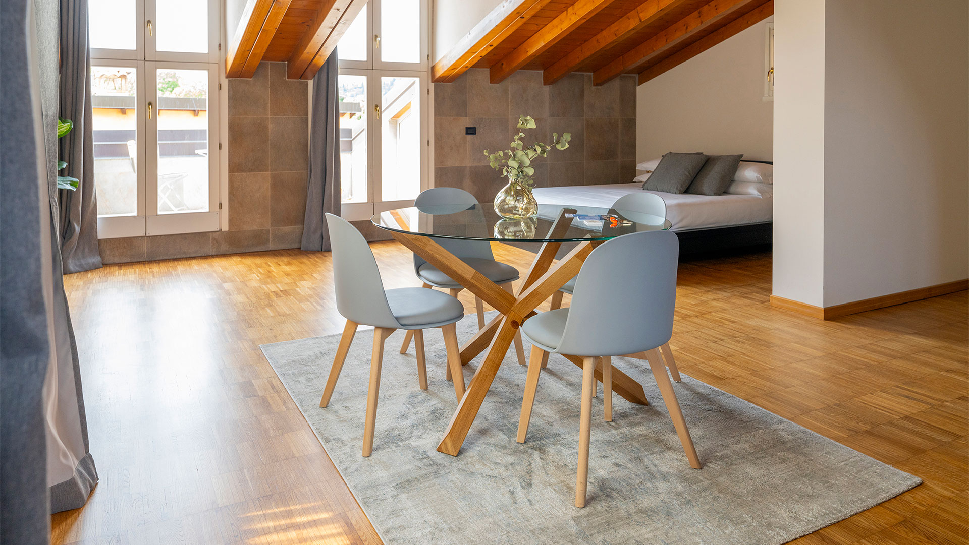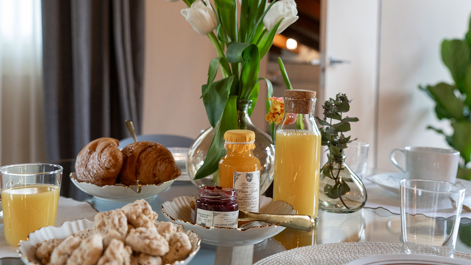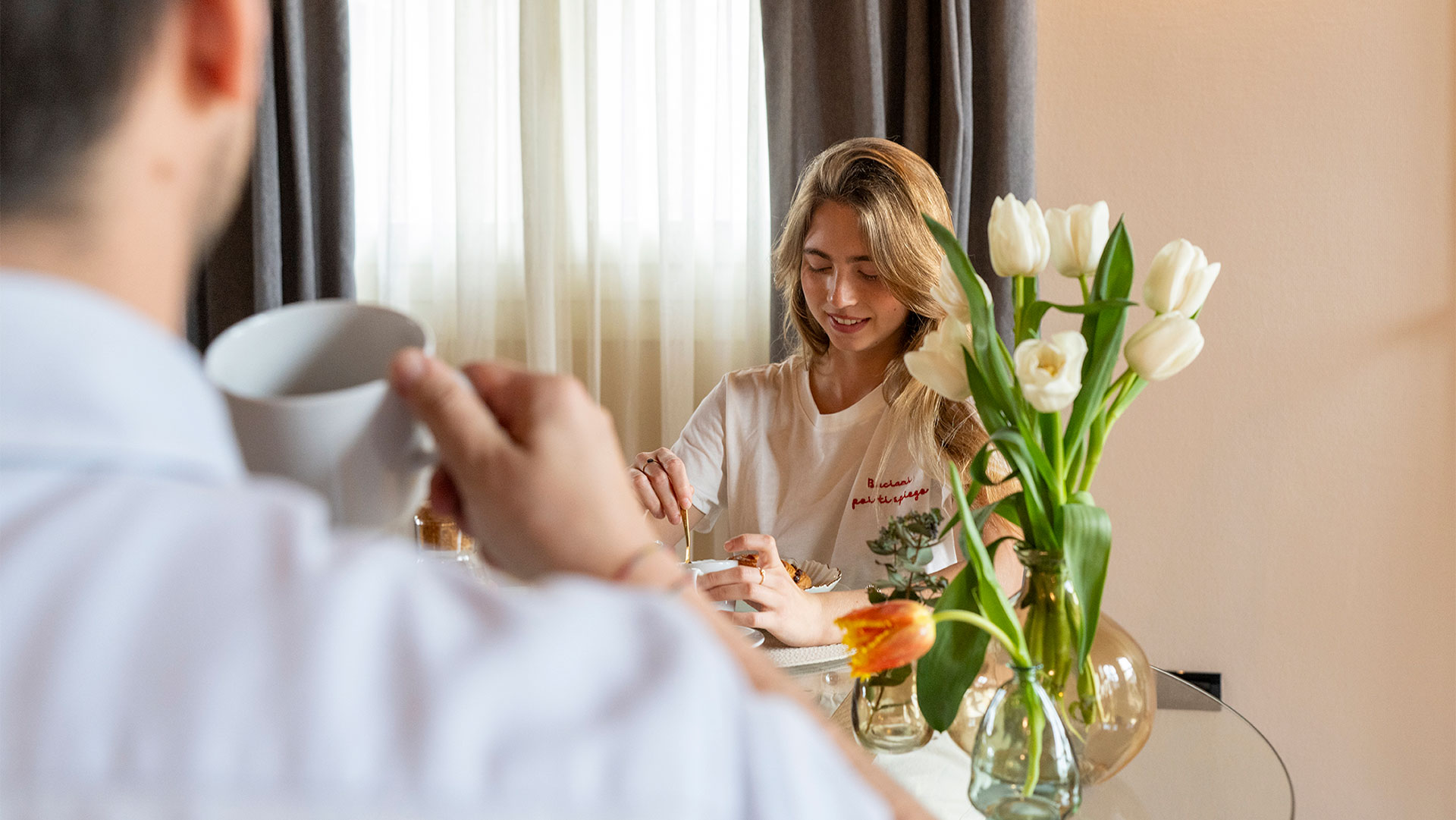 Il terrazzo privato offre una vista incantevole sui tetti del quartiere e sulla Città Alta, creando l’ambiente ideale per una colazione all’aperto, per una pausa relax sotto il tiepido sole delle giornate primaverili o per un gustoso aperitivo al tramonto in buona compagnia.